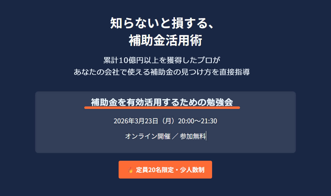 本勉強会では、17年にわたり補助金獲得を支援してきたプロが、「今、あなたの会社で使える補助金」を見つける方法と、採択されるためのポイントを90分で解説します。